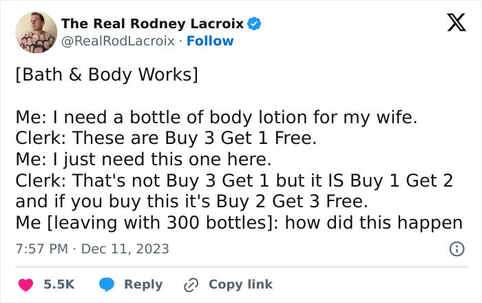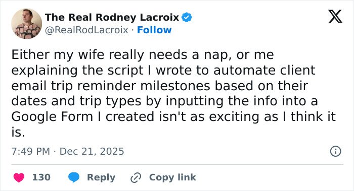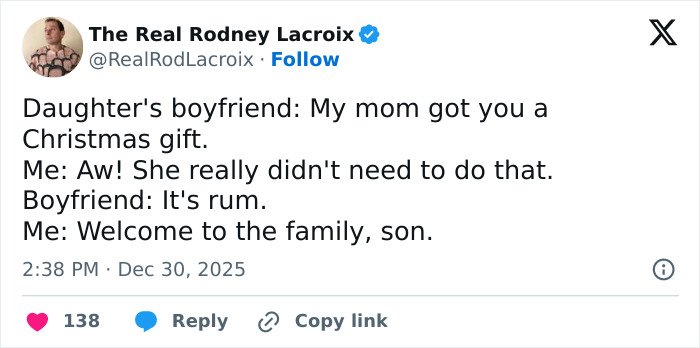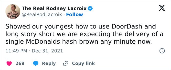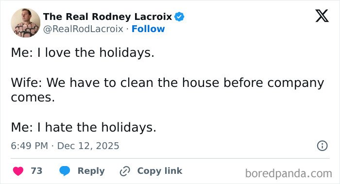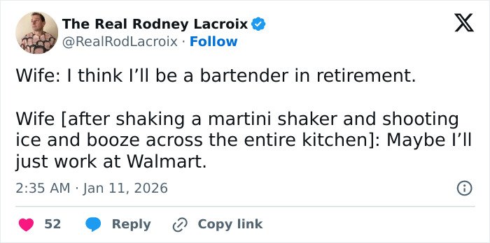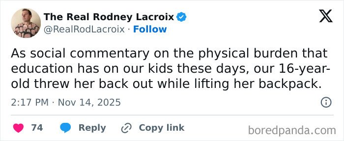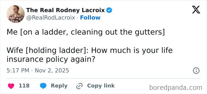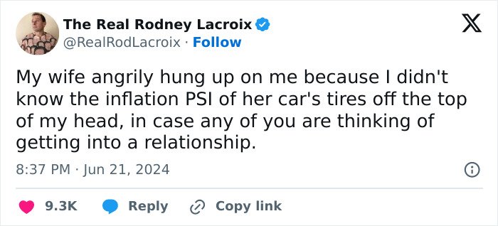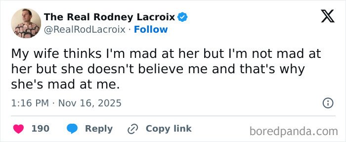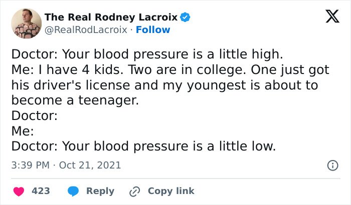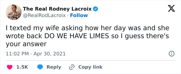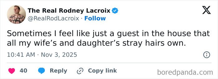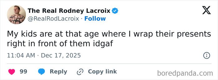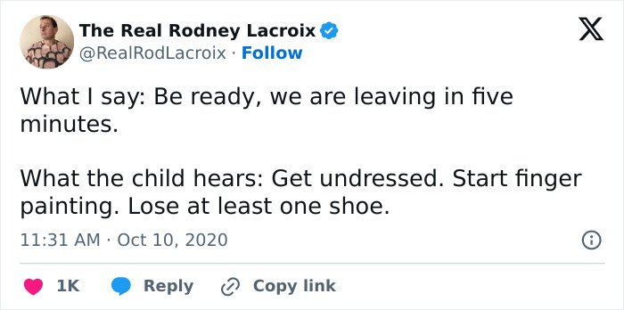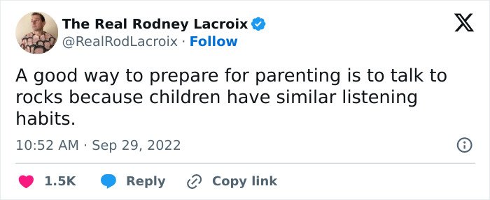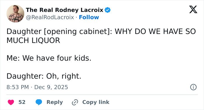 Below, you’ll find a list of the funniest posts “The Real Rodney Lacroix” has shared on X about marriage and raising kids. If you have children of your own, you may find this list painfully relatable, but we hope that it will remind you that all parents are in the same boat: just trying to do their best. Enjoy spending a few minutes reading through these posts, even if you have to hide in the bathroom from your kids to do so, and be sure to upvote the ones that make you giggle!