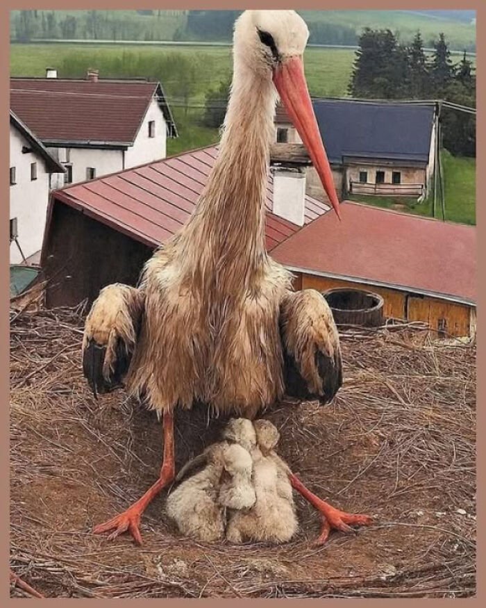 #55 Father Of The Year: After The Mother Stork Tragically Died From High-Voltage Power Lines, The Devoted Father Stayed To Care For His Four Chicks