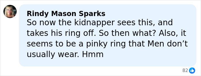 “So now the kidnapper sees this, and takes his ring off. So then what? Also, it seems to be a pinky ring that Men don’t usually wear. Hmm,” added a third.