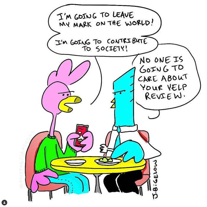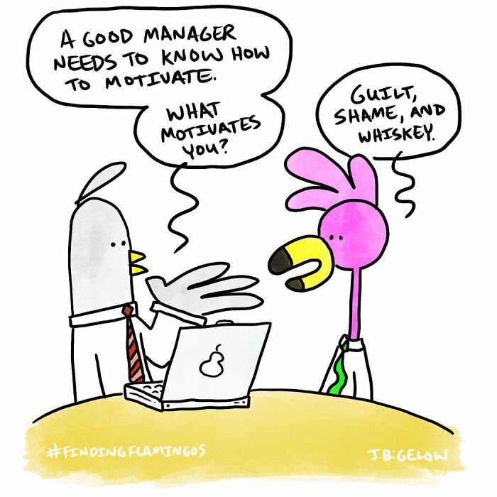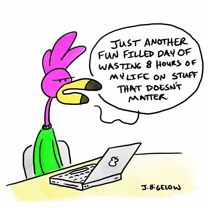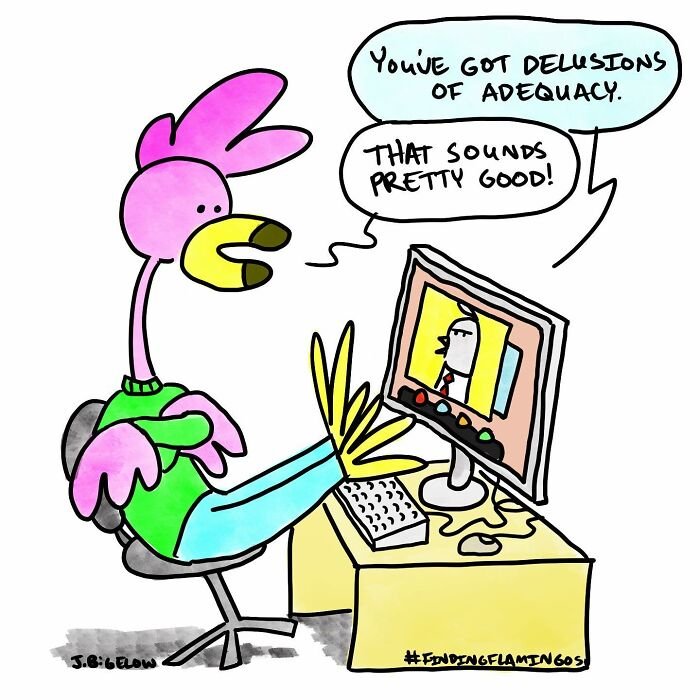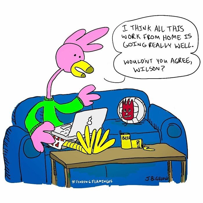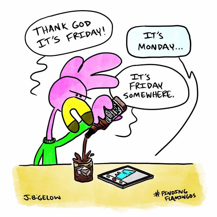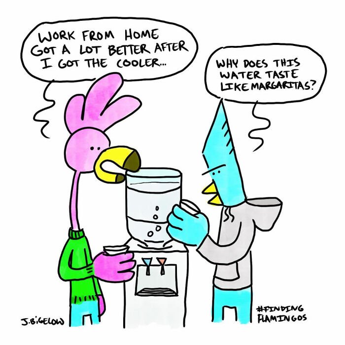 Bored Panda was interested to learn more about the cartoonist and his series, so we asked a few questions, to which Johnathan kindly responded. First, the artist elaborated on the recurring themes in his work: “A lot of my comics explore the absurdities of modern life—workplace nonsense, interpersonal dynamics, and those universally relatable small moments. However, Finding Flamingos also delves into themes like anxiety, loss, self-abuse, addiction, depression, loneliness, and desperation—words not typically associated with humor comics. I think this mix allows for a therapeutic voice in the comic, helping me (and others) laugh at ourselves and the realities of our own work and personal lives.