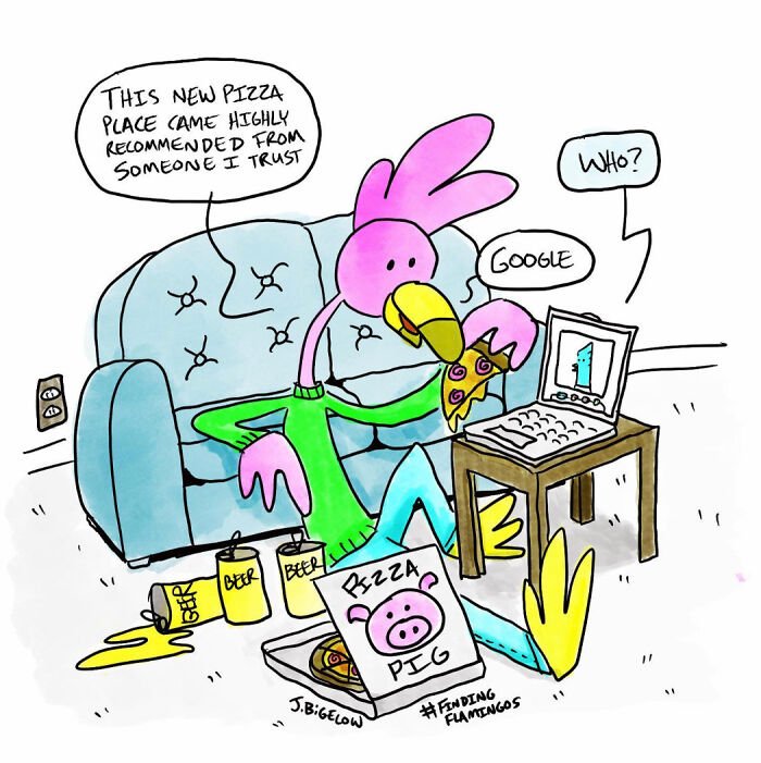 The cartoonist shared with us what inspired him to start creating the series: “I grew up reading newspaper comics over breakfast before school and developed an early love for the medium. In grade school, I taught myself to draw by tracing my favorite strips. I’ve always loved humor but have never been outgoing or confident enough to try stand-up comedy, so comics became the perfect outlet for me to combine two passions: humor and drawing. Over my lifetime, I’ve drawn over 4,000 comics. My first major project was ‘A Rusty Life’, followed by a comic called ‘Stairwell’, which I created daily for nearly four years. Eventually, I wanted to explore a completely different style, and that’s how ‘Finding Flamingos’ came to life. It started as something I’d casually doodle during lunch breaks at office jobs, often while having a beer, but the more I worked on it, the more excited I became. Over time, the character and the strip evolved into what it is today.”