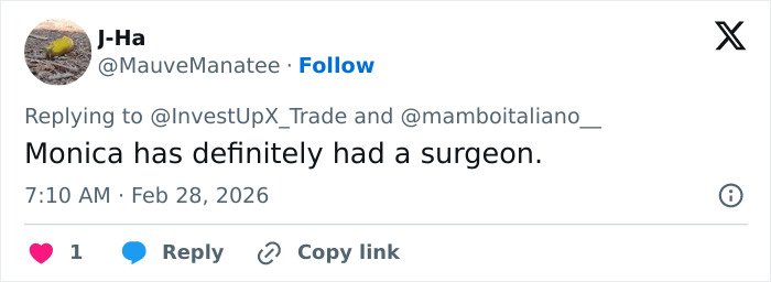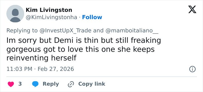 “Monica is gorgeous! Demi could be in her league if she had laid off the O*empic,” wrote one user.